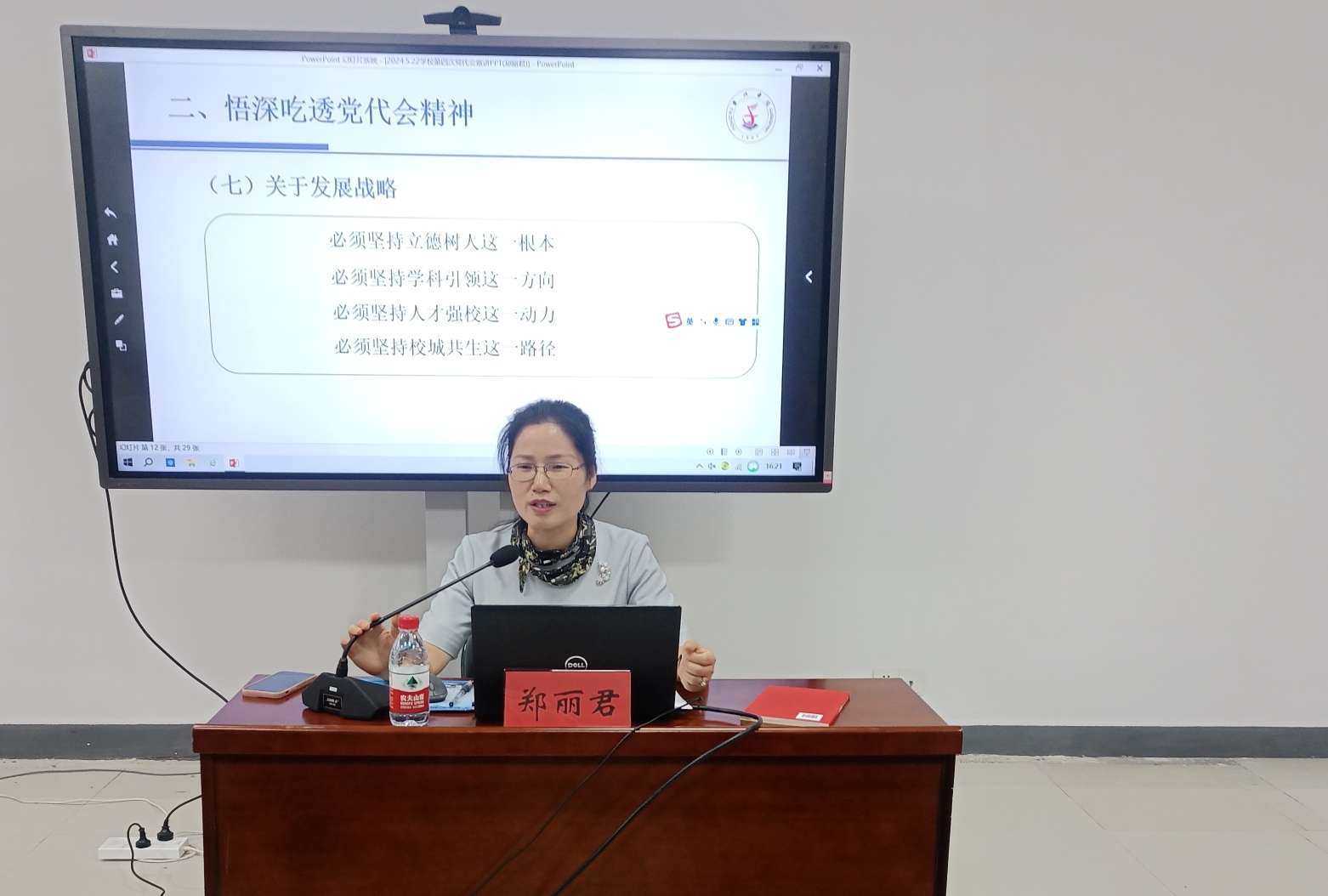 郑丽君首先介绍了校第四次党代会总体情况,并就报告标题、大会主题、过去五年工作、学校使命、发展愿景、发展目标、发展战略、任务举措、党的建设等九个方面,对学校第四次党代会精神作了全面、深入、系统地解读。她指出,大学生要珍惜在校的学习时光,把个人成长与学校发展紧密联系起来,不忘初心、勇毅前行,努力成长为具有家国情怀、垦荒之志、扎实本领的高素质应用型人才。