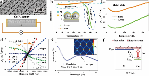 图1. 双金属阵列超低电阻率半导体 (a)样品示意图,(b)金属-超级半导体转变,(c) b低温金属区间放大图,(d)不同温度下的霍尔曲线,(e) FDTD模拟显示阵列结构在室温热红外有等离子共振光吸收, (f) 超级半导体能级示意图。