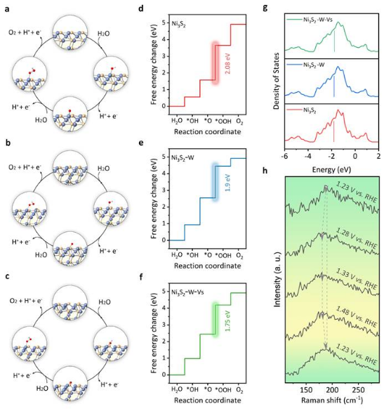在众多析氧催化剂中,Ni3S2是一种重要的材料。钟文武教授团队创新性地提出一种同时调控Ni3S2中Ni原子局域能带结构及电子自旋状态的方案。W原子和S空位的共同掺杂提升了d带中心的同时,通过元素之间的电荷转移优化了eg电子数,从而良好地平衡了对*O和*OOH的吸附,使Ni3S2的析氧活性有了巨大提高。在100 mA cm-2的电流密度下,优化后的Ni3S2的过电位仅为246 mV,Tafel斜率为66 mV dec-1。
