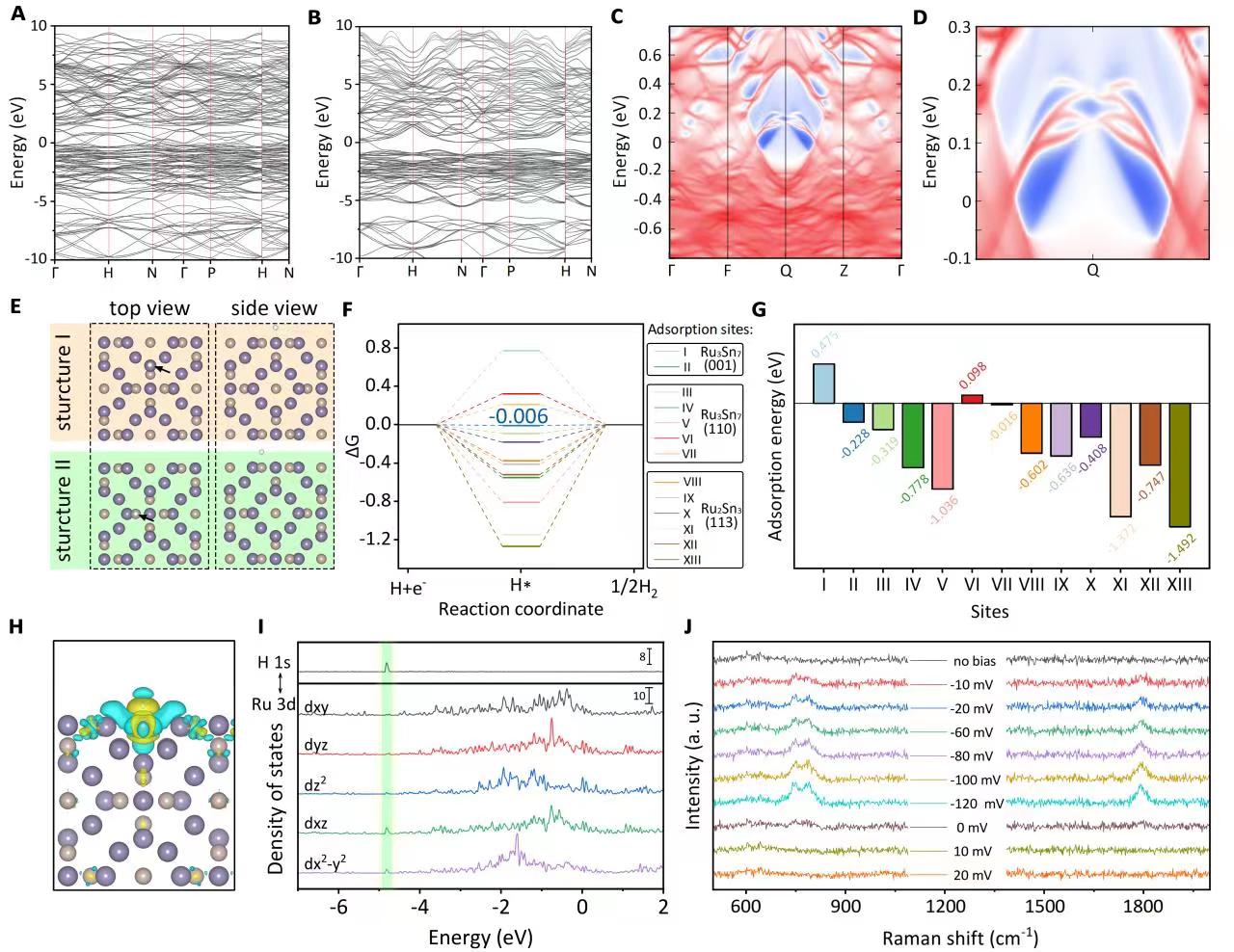 这项研究使用电弧熔炼法制备了一种拓扑非平凡金属Ru3Sn7。实验结果表明,Ru3Sn7的(001)晶面族具有非平凡拓扑表面态,这些表面态具有极高的载流子迁移率,并且受到体材料对称性的保护。此外,这些表面态还具有线性色散关系和大的非平凡能量窗口。通过XRD和STEM测量,发现所有样品都具有高相位纯度和卓越的晶体结构,这为区分非平凡拓扑表面态的影响奠定了基础。在宽pH范围内进行析氢反应实验,结果显示Ru3Sn7是一种高效电催化剂。通过理论计算、同步辐射、原位拉曼等手段,证实了非平凡拓扑表面态对析氢性能的提高起到关键性作用。该研究为探索非平凡拓扑表面态作为高效电催化剂提供了新思路和实验基础。