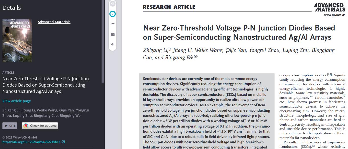近日,公司77779193永利集团2020级材料物理专业学生李季腾、周雍瑞,在学院李志刚教授指导下,于国际上首次基于金属纳米阵列合成具有半导体特性的p-n结。研究论文Near Zero-threshold Voltage P-N Junction Diodes Based on Super-semiconducting Nanostructured Ag/Al Arrays,以台州学院为第一单位,在国际权威期刊Advanced Materials(IF:32.086)发表。