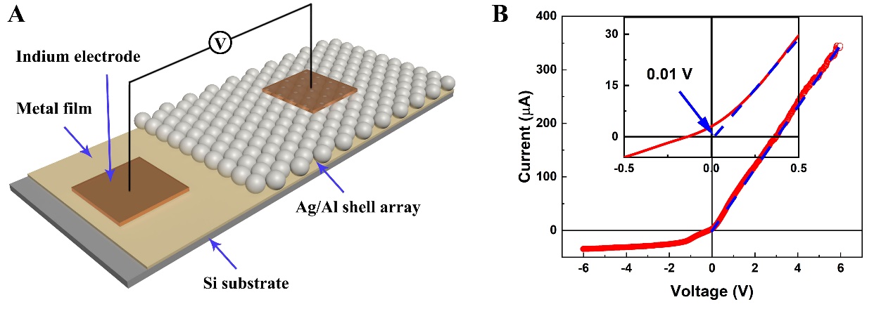 图2 Ag/Al球壳阵列(A)p-n结结构和测试示意图和(B)室温下的I-V曲线,插图为局部放大