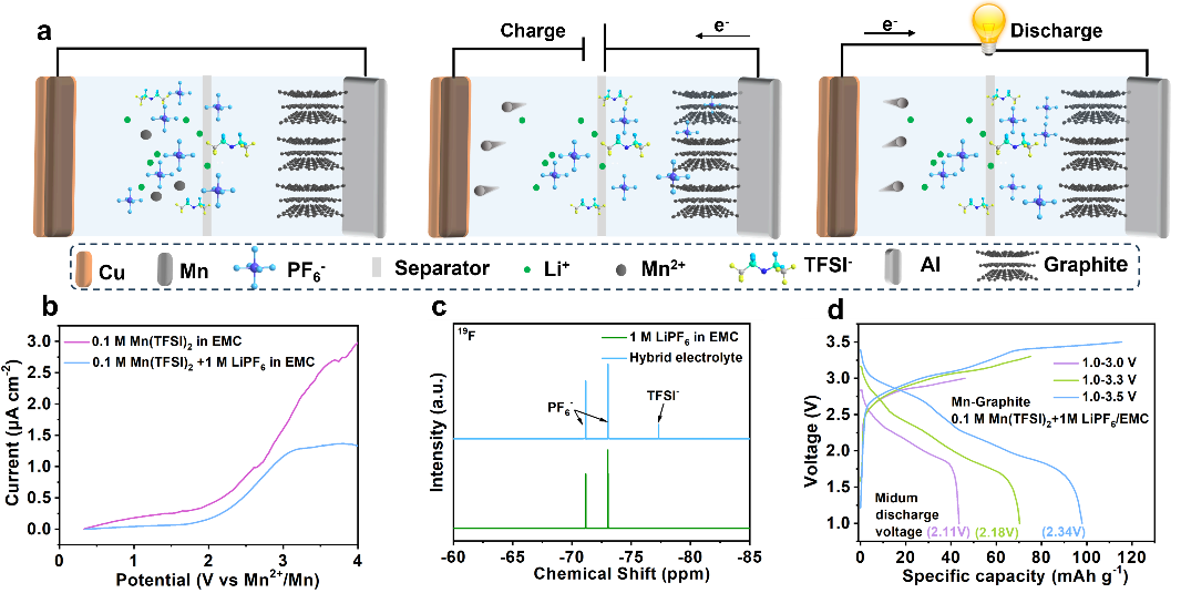 该论文创新性地将阴离子插层石墨正极运用到锰金属电池里面,提出了Mn||Graphite电池体系。充电时金属锰离子在负极沉积,电解液中PF6-和TFSI-在石墨正极中嵌入,放电时该过程可逆。并且该体系中运用了一种混合离子电解液,LiPF6的加入既提高电解液的电导率、钝化了集流体又同时提高了该电解液的氧化电压。合理调节电压窗口后,该电池可以输出最高2.34 V的平均放电电压。