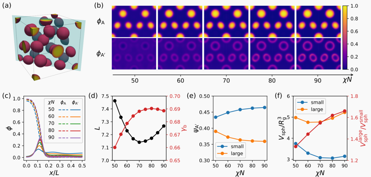 在本研究中,论文作者基于自洽场理论(SCFT)与机器学习的方法,对AB型嵌段共聚物在广泛参数空间下的相行为进行高精度扫描。研究发现,在一定的体积分数比与链段互作用参数条件下,系统的自由能最小值对应于一种混合型球形Laves相结构(C14和C15类型)。这一结构的形成无需任何外场调控或第三组分引入,完全由链构型的几何拓扑与链段的分离强度驱动。论文进一步指出,该Laves相因为同时具备不同的自发曲率,因此可以看作是一类新型的混杂结构。同时,文章提出了“分子内共混”自组装机理,该理论预测不仅挑战了对嵌段共聚物球形相分类的传统认知,也为实验上探索复杂球形结构以及混杂相结构提供了理论依据。审稿人对该工作的巧妙与前瞻性给予高度评价,认为其“拓展了人们对多嵌段共聚物软物质体系形成机制的基本理解,具有重要的理论意义”。