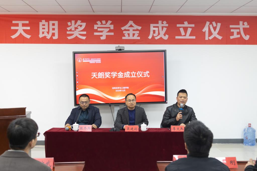 吴建波在致辞中对杭州天朗金属科技有限公司表示了最诚挚的感谢,他表示天朗奖学金的设立,体现了优秀企业家对社会的责任担当,更体现了天朗公司对学院材料专业的支持和对学院学生的关心。他强调,青年强,则国家强,当前国家正处于建设世界主要科学中心和创新高地的新征程,新材料作为三大科创高地,未来大有可为,专业前景十分广阔。希望同学们立足材料专业,求实创新、追求卓越,成为材料专业高素质应用型人才。