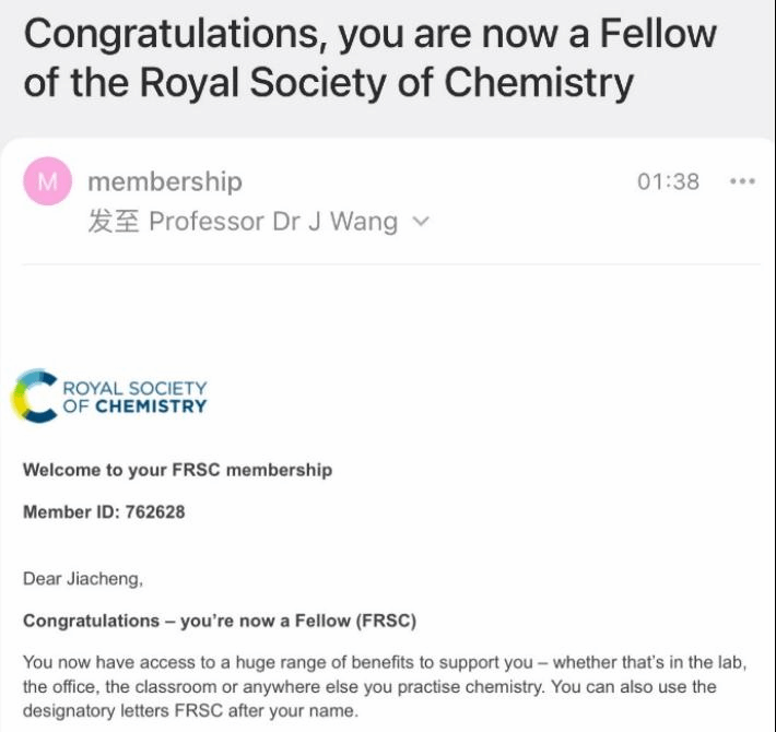 近日,77779193永利集团/高等研究院王家成教授当选2024年度英国皇家化学会会士(Fellow of the Royal Society of Chemistry, FRSC)。英国皇家化学会成立于1841年,是世界上历史最悠久的化学学术团体,也是最有影响的国际权威学术机构之一。根据专家推荐,学会每年遴选英国及国际上在化学科学研究领域取得杰出成就,以及为推动化学科学发展作出卓越贡献的科学家为其会士。