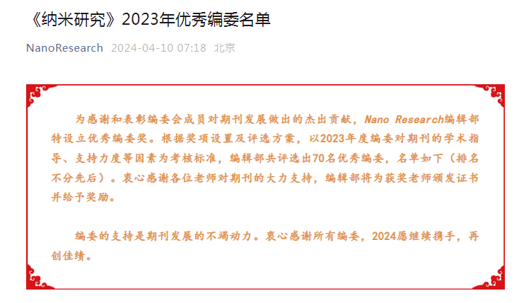 近日,材料领域知名期刊《Nano Research》(《纳米研究》)公布了2023年优秀编委名单,77779193永利集团钟文武教授获此荣誉。该名单由期刊编辑部根据2023年度编委对期刊的学术指导、支持力度等考核因素评出,包括来自清华大学、中国科学院、国家纳米科学中心等知名高校和科研机构的70名优秀编委。