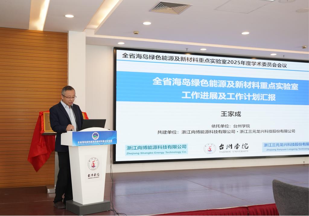 2025年4月26日,全省海岛绿色能源及新材料重点实验室(以下简称“重点实验室”)揭牌仪式暨学术委员会第一次会议,在台州学院椒江校区隆重举行。校长、党委副书记乐传永出席活动并致辞,台州市科技局局长王智承、公司副校长韩得满,重点实验室学术委员会主任、浙江大学求是讲席教授陆俊(国家海外高层次引进人才)等国内知名高校和科研院所的专家学者,重点实验室共建单位浙江尚博能源科技股份有限公司、浙江三元龙兴科技股份有限公司相关负责人,以及玉环市科技局、黄岩区科技局代表应邀出席,重点实验室主任王家成以及骨干教师参加活动。活动由校科技处处长金燕仙主持。